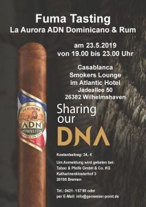 Am 23. Mai 2019, ab 19:00 Uhr führen wir ein Fuma-Tasting in der Casablanca Smokers Lounge des Atlantic Hotels Wilhelmshaven (Jadeallee 50, 26382 Wilhelmshaven) durch. Der Abend wird veranstaltet vom CIGAR CLUB Wilhelmshaven e.V., Arnold André und der Firma Tabac & Pfeife in Bremen der Ihnen im Verlauf des Abends drei verschiedene Rumsorten vorstellen wird. Nach dem Fuma-Tasting können die Teilnehmer gerne noch zum gemütlichen Ausklang des Abends, aus der neuen Cigarrenserie von La Aurora, eine weitere Cigarre probieren.